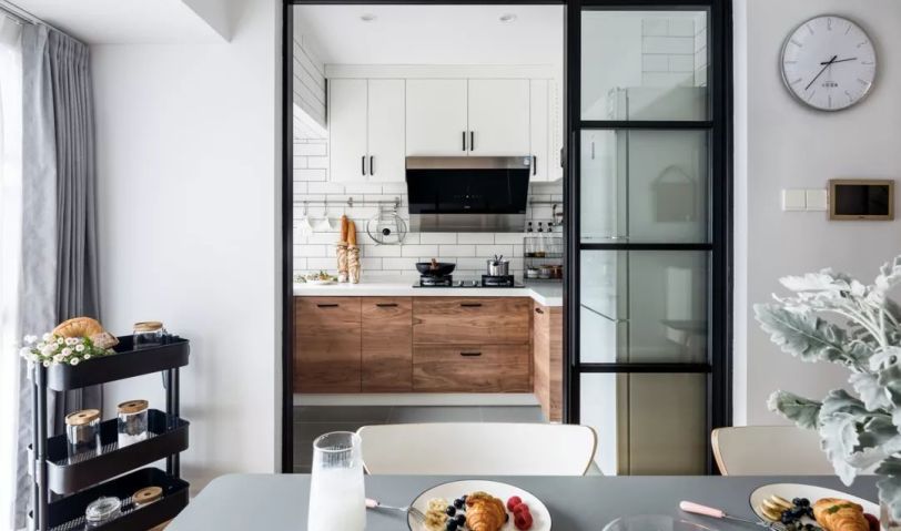 玻璃推拉門,增加廚房與餐廳的互動性。推拉門也更加節省空間。