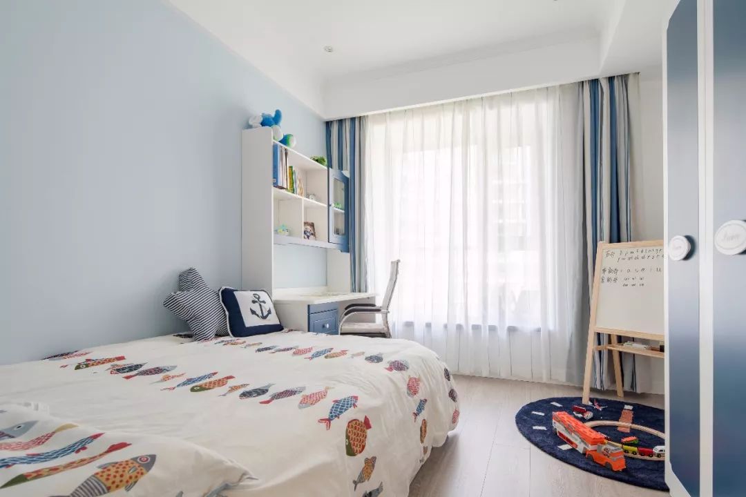 兒童房利用藍(lán)色與白色拼接的模式裝點(diǎn),靠墻的床,為小朋友留足了活動(dòng)空間。