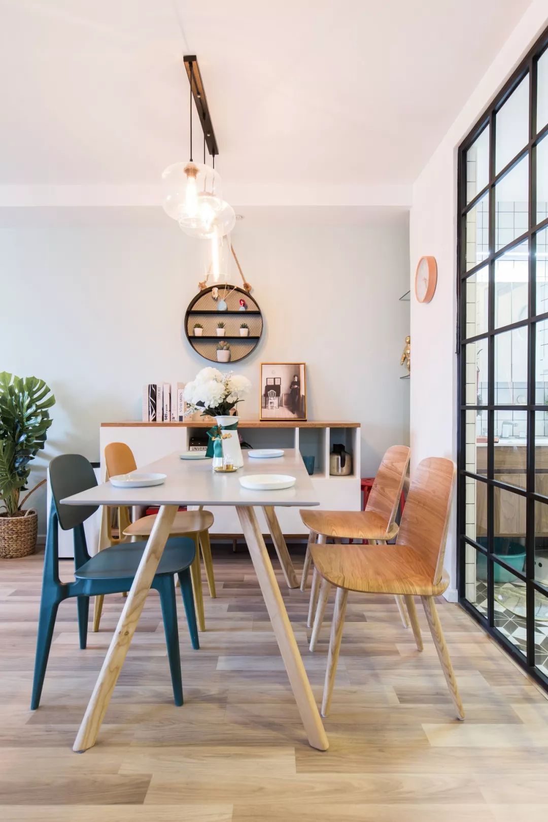 餐廳與衛生間干區的分隔采用了黑色鐵藝玻璃隔斷,空間的采光與通透度都得到提高。