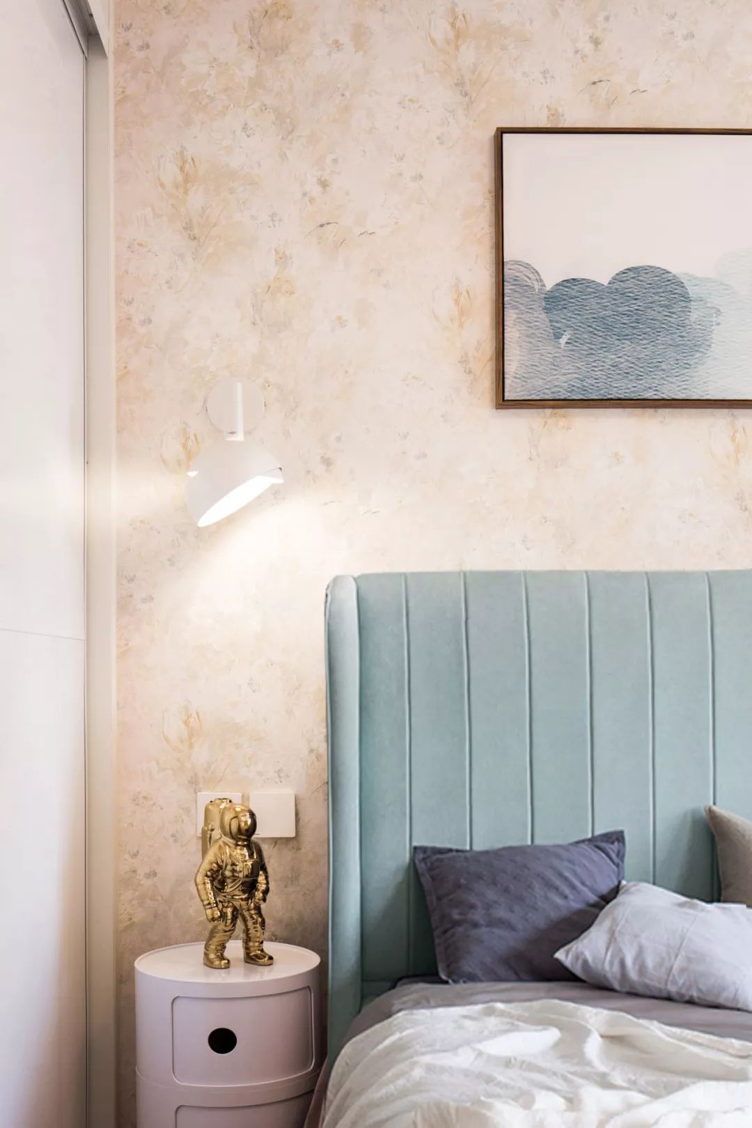 主臥馬卡龍藍色的床頭與客廳沙發背景色調相呼應,床頭與暖色系壁紙形成對比,溫暖的壁燈燈光,成為空間中最舒適的居心地。
