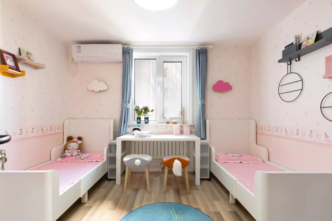 女兒房是重點規劃設計的空間,兩張小床分別靠墻擺放,提升安全感。靠窗是孩子們的學習書桌,中間留出了足夠的空間給孩子們玩耍。