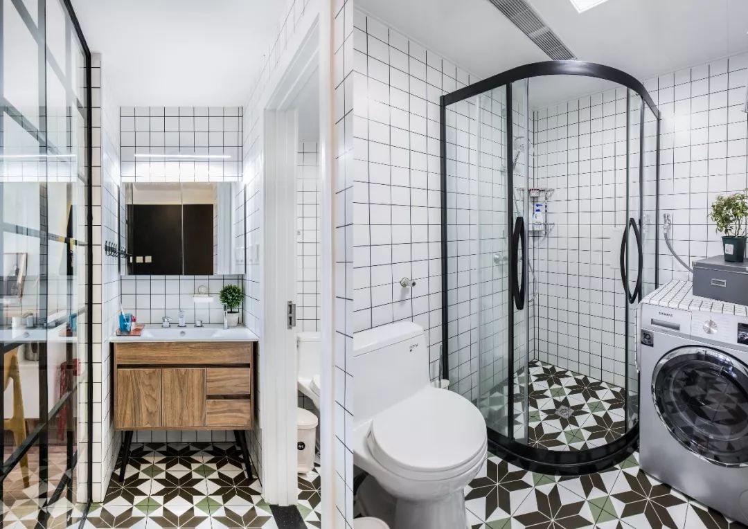 干濕分離的衛生間設計,使用大量現代的元素,原木色的干區臺盆柜,與白色瓷磚的結合,加上黑色色金屬拉手和柜腳,使整個空間更加飽滿。