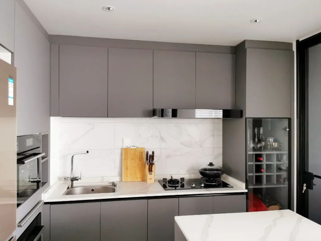 廚房原本是超長(zhǎng)一字型,改成開(kāi)放式設(shè)計(jì),操作臺(tái)放置洗菜盆和灶臺(tái),中間用來(lái)切菜,后面配了一個(gè)中島,一個(gè)轉(zhuǎn)身實(shí)現(xiàn)所有操作。
