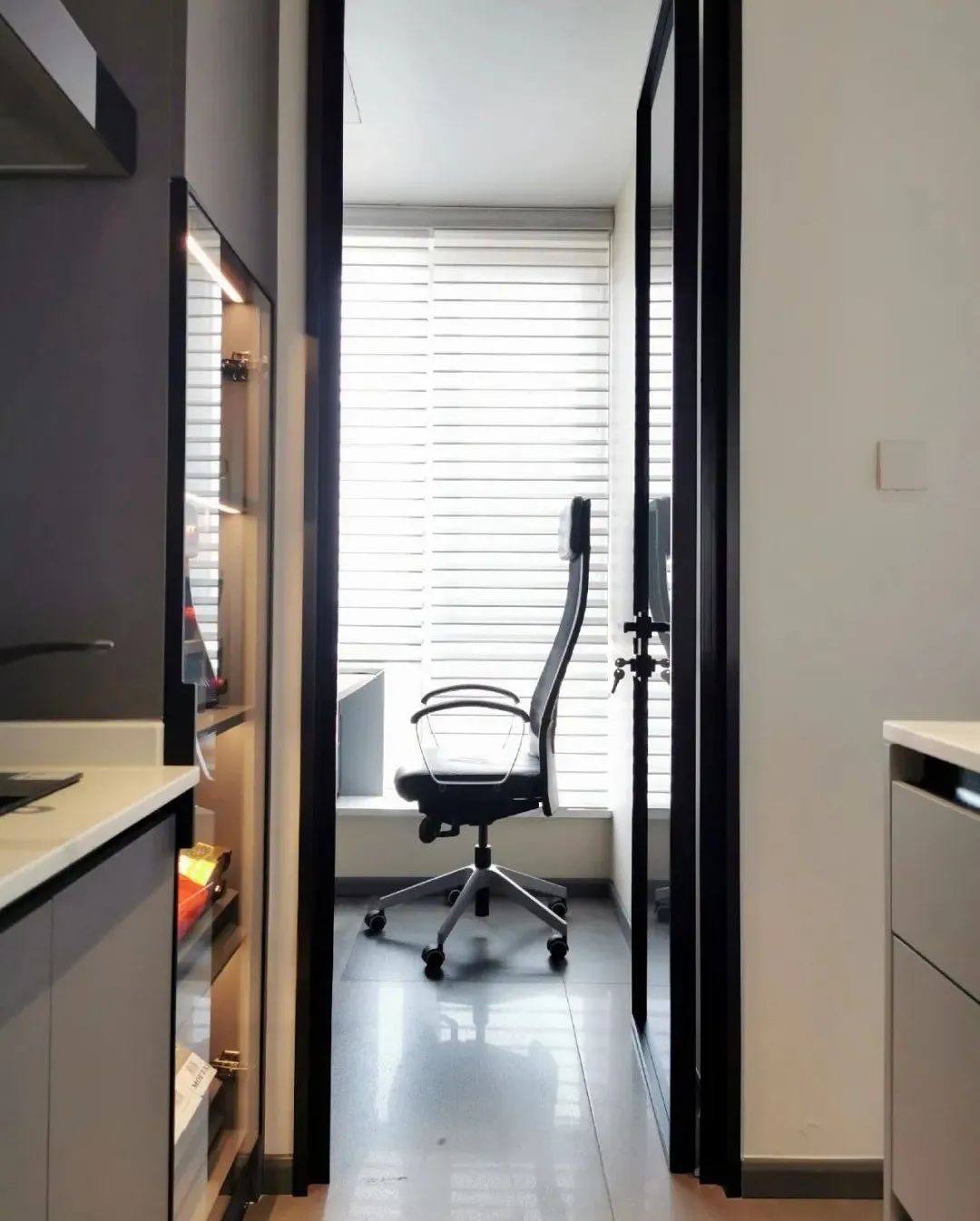 借用原本廚房的一部分面積,打造了兩平米的書(shū)房,放置寫(xiě)字臺(tái)和高柜。房門(mén)采用玻璃門(mén),增加空間的通透感。