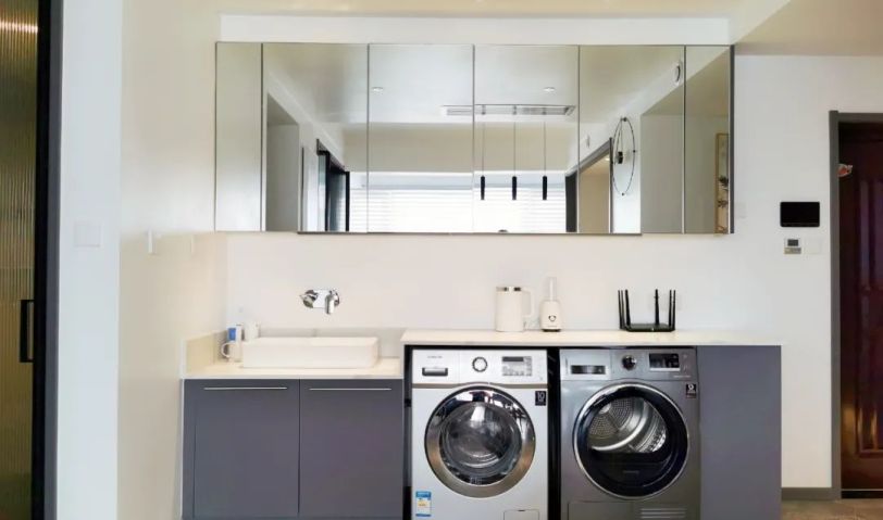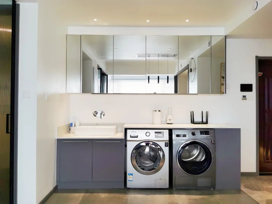將原來(lái)的餐廳改造為衛(wèi)生間干區(qū),放置洗衣機(jī)、烘干機(jī)、洗手盆。