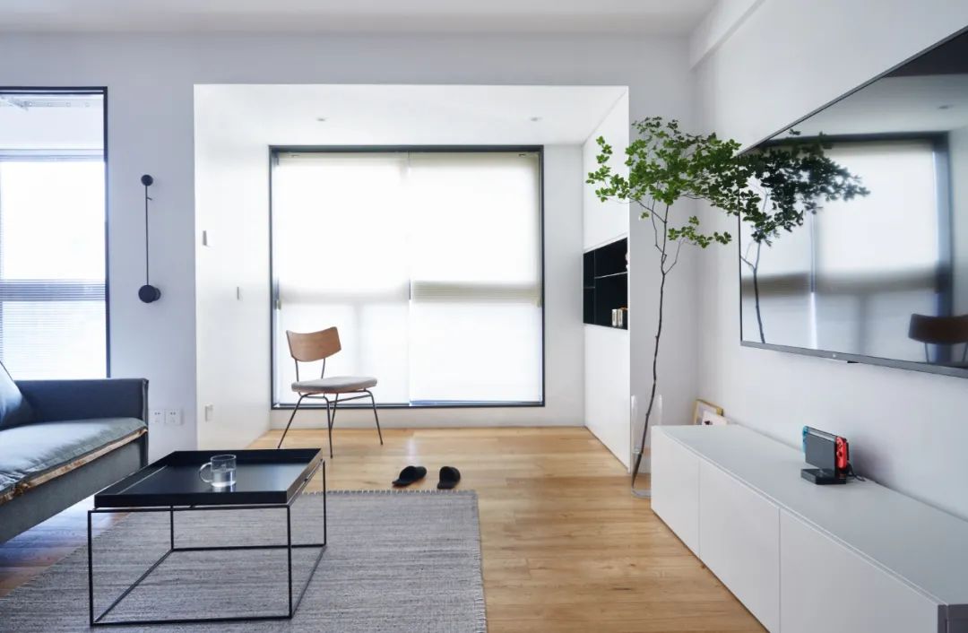 狹長的陽臺一分為二,一部分納入客廳,寬闊的落地窗設(shè)計(jì)極大地改善了室內(nèi)的采光效果,視覺上看起來干凈明亮。