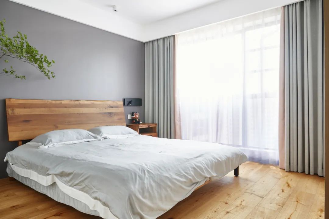 臥室自然清爽,營造更加放松而舒適的休息環(huán)境。大面積灰白墻面與床頭的原木色形成對比,一明一暗,一深一淺,鮮明的差異化表達(dá)讓視覺層次更加豐富。
