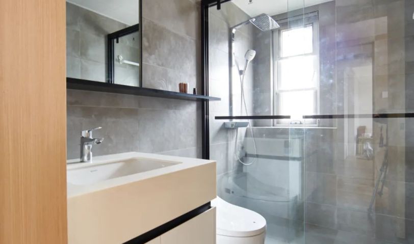 衛(wèi)生間以黑白灰為主色調(diào),玻璃隔斷有效增加了室內(nèi)采光。