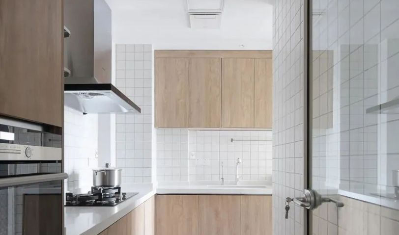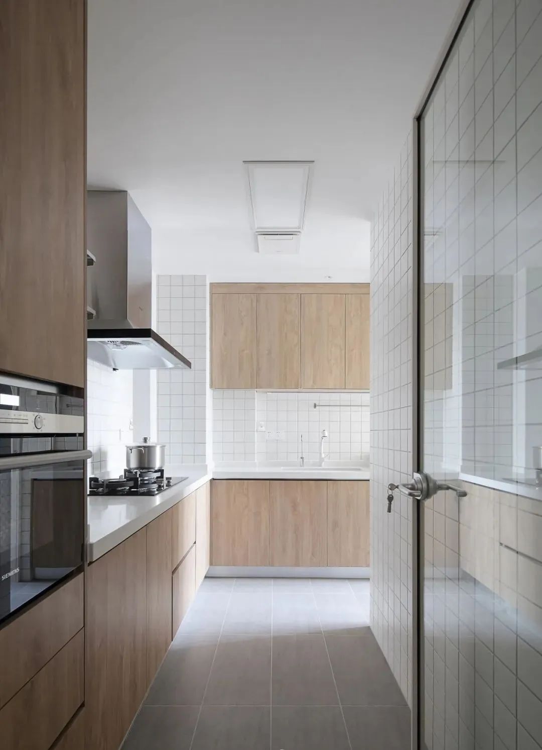 廚房的色調跟整體空間很好的保持了一致性。陽臺增加了臺面,擴展了廚房的可操作性。