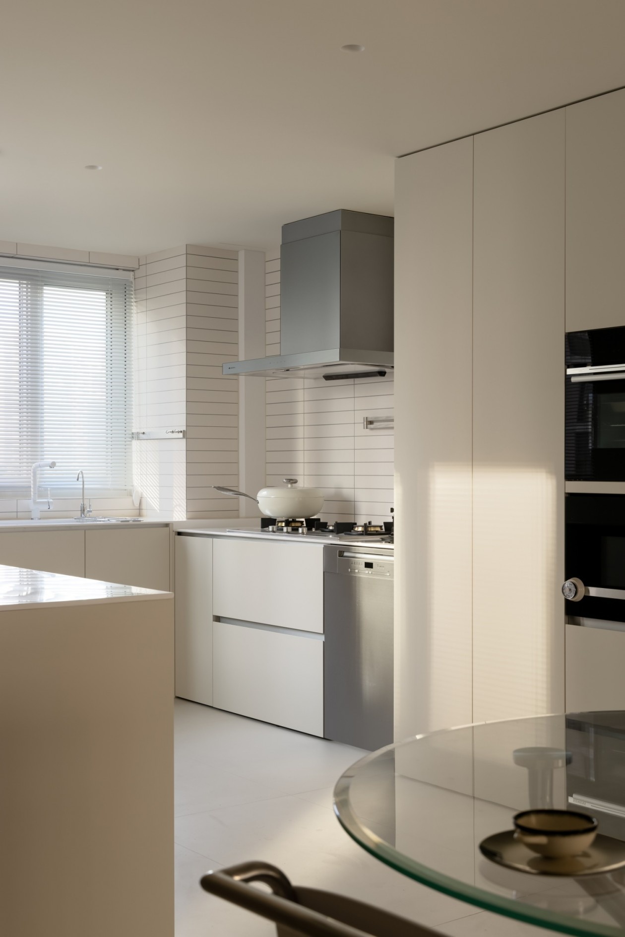 造型獨特的玻璃圓桌為整個溫柔的空間帶來張力與跳躍