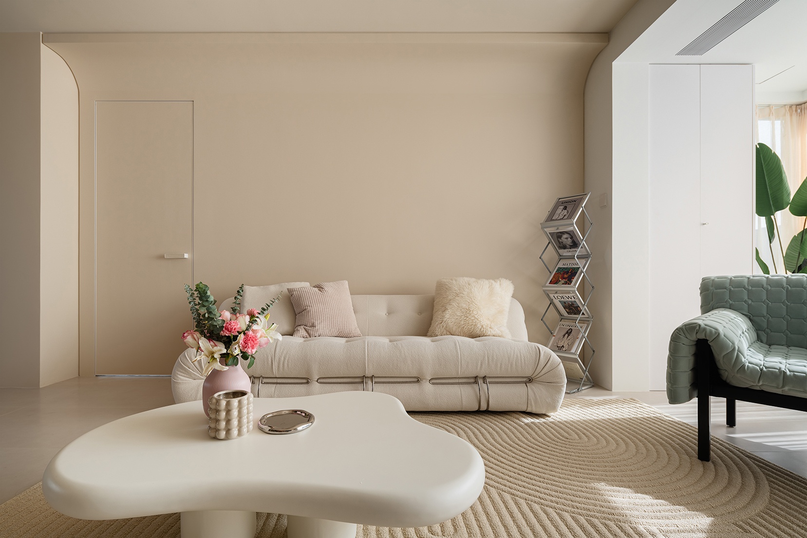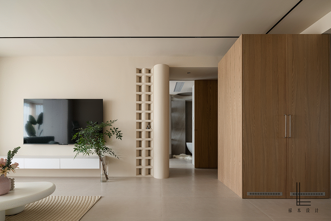 一梯一戶讓門廳的空間得到了最大化的利用,引入眼簾的的木紋色系的柜體,平衡著客餐廳的空間。左側包容了一家人休息、嬉戲、放松的空間。設計師從空間造型,到軟裝搭配都以柔美為主,造型墻的虛實結合使空間的更加的靈動。