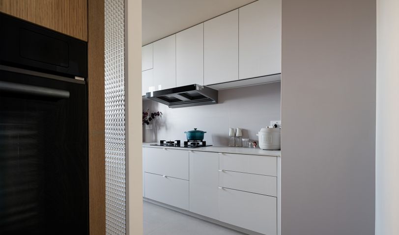 餐廳沒有繁瑣的結構造型,在豐富功能性的同時,在材質和柜體造型上加以點綴,木色柜體結合藤編門 精致的小把手無疑是錦上添花。